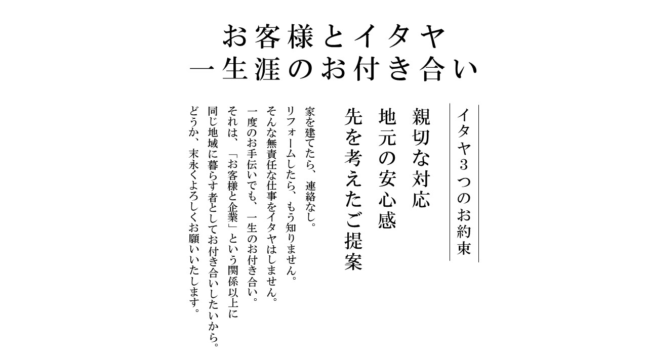 株式会社イタヤです。イタヤは地域の見守り隊として、リフォーム・増改築を主体に家に関する全ての工事をしています。増改築工事からクロス・襖・照明取替まで何でもやっています。
