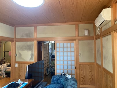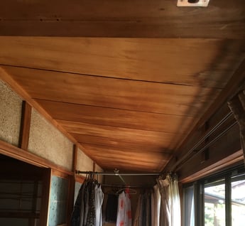 縁側屋根の谷樋が雨漏れの原因でしたので谷樋を修理しました。天井が無垢の天井でしたので1枚べニヤ板を重ね張りして仕上げはクロス張りとしました。床は抗ウイルス仕様のエアー・ウォッシュ・フローリングを重ね張りさせていただきました。